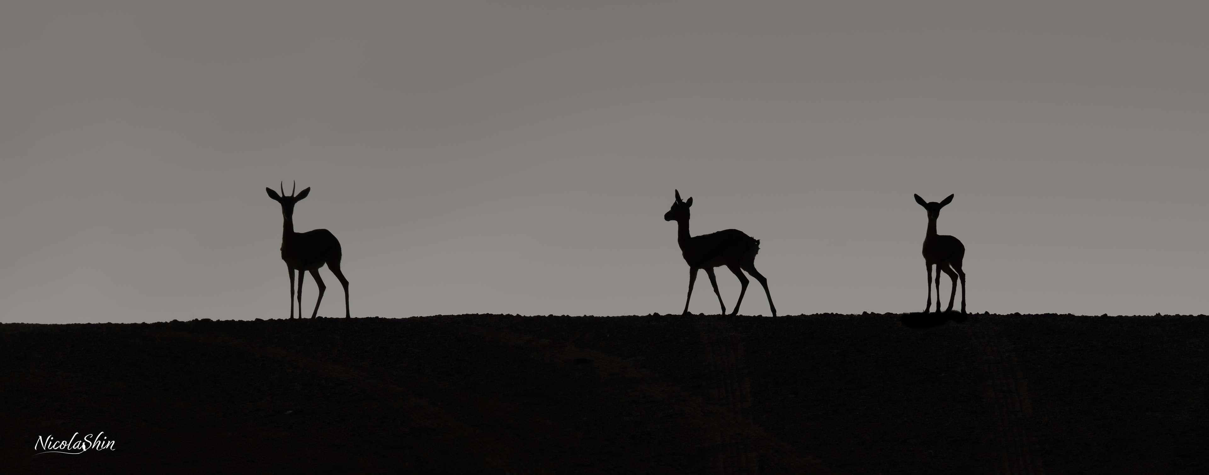 Arabian Gazelles are typically more territorial and agile, often darting into rocky hills and wadis when disturbed. In contrast, Sand Gazelles are more suited to open terrain and rely on speed and distance rather than cover. Both species exhibit a strong awareness of their surroundings and will often freeze before fleeing, making them challenging but rewarding subjects for wildlife photography.