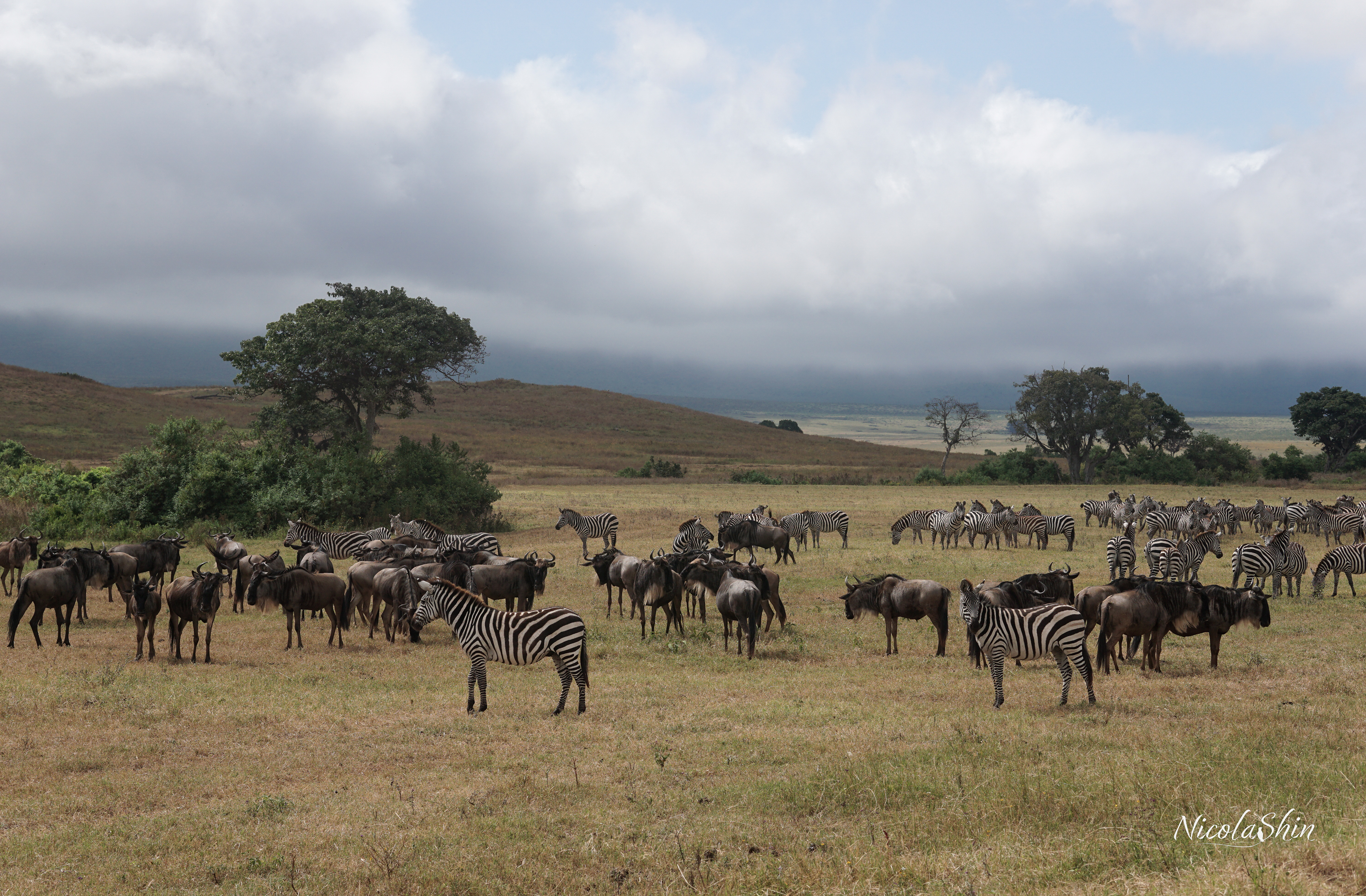 We arrived at the Ngorongoro Conservation Area in the late afternoon and spent the night above the crater at an elevation of 2,300 meters. The temperature, even in June, is quite cold during the night, the fog keeping the atmosphere quite humid.